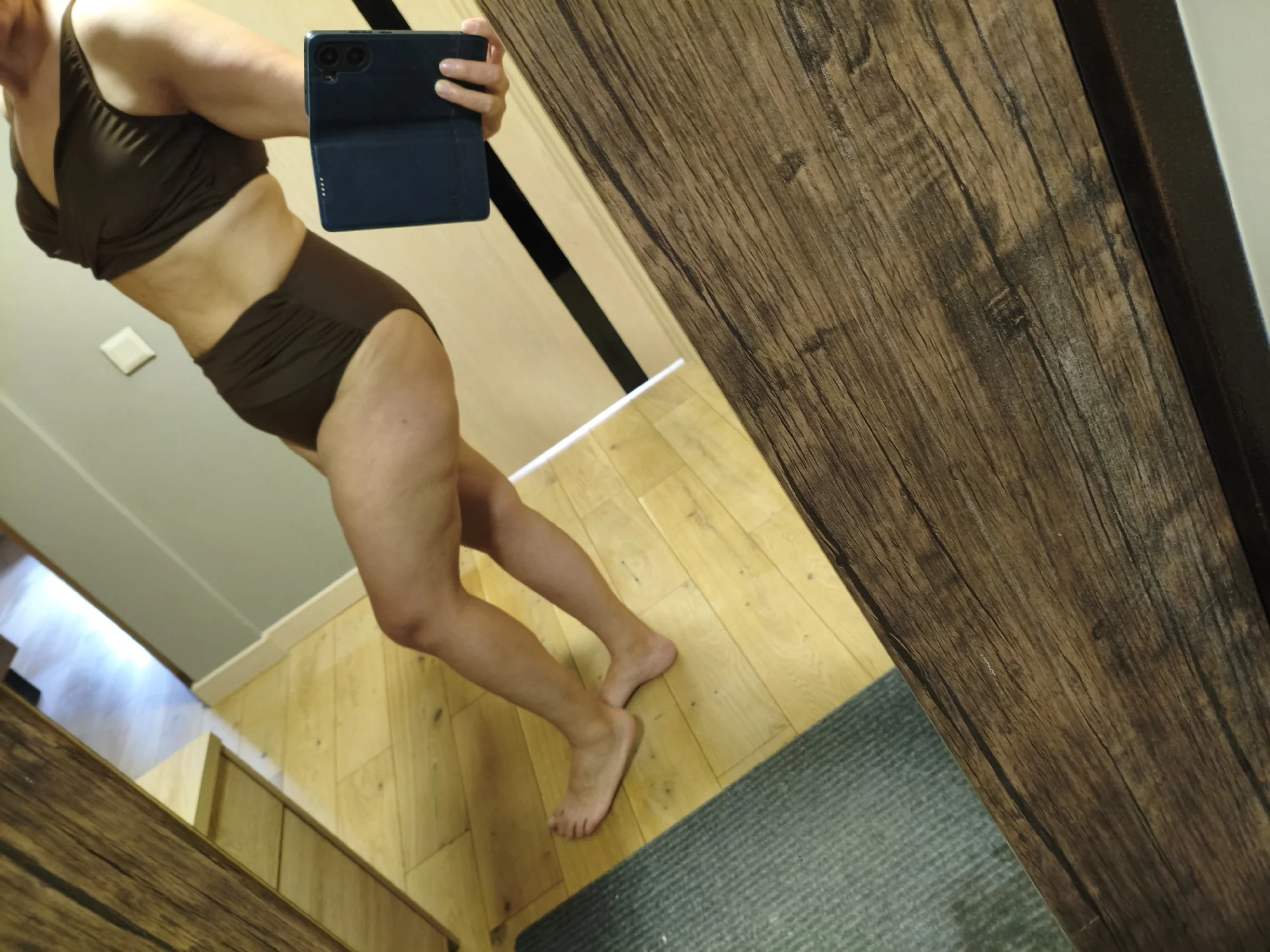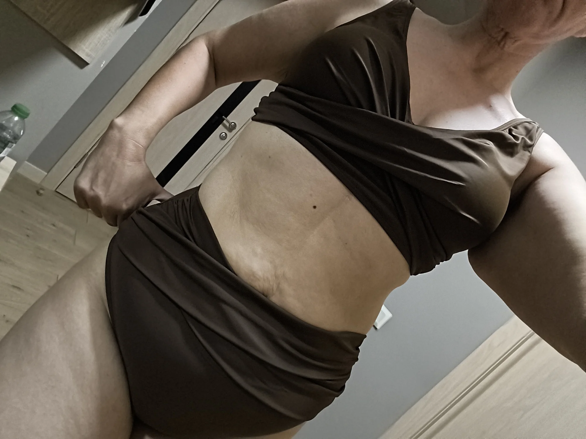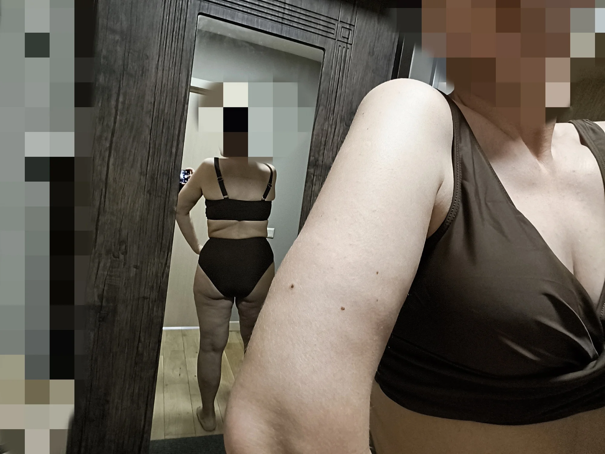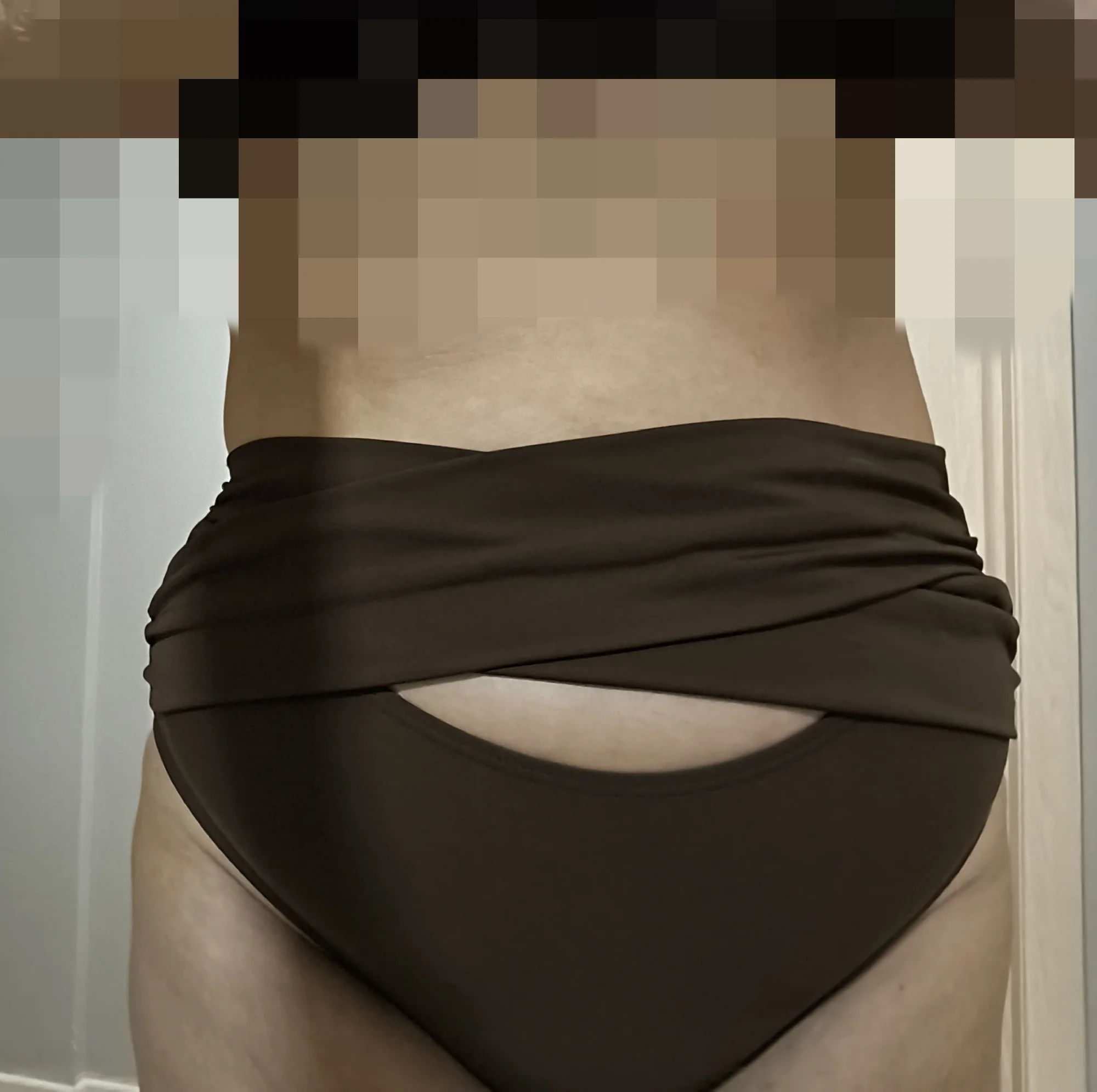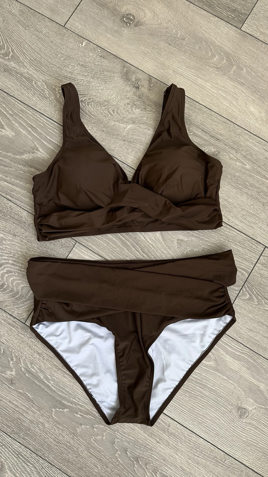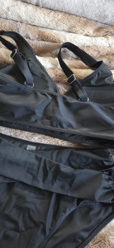 The panties are high-waisted and comfortable, but since there's a bit of a belly, the top part slips up a little, although there's even a charm in that. . The bodice is slightly loose for a two-piece set, but due to the draping, it's not noticeable. . I wear size 48/2, it fits loosely; I always take a slightly larger size to avoid pressure anywhere.
