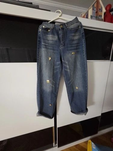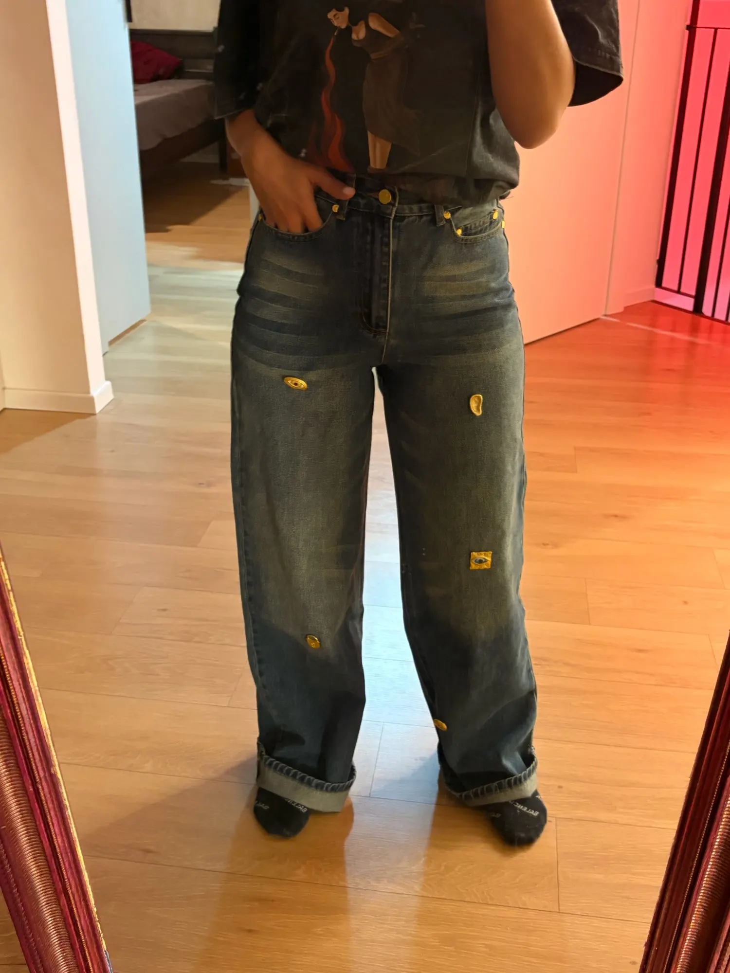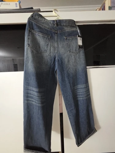 Effortlessly elevate your everyday style with these women's baggy jeans. Featuring a high-waisted silhouette and relaxed wide-leg cut, they deliver comfort without compromising on trend appeal. The spliced design paired with subtle metal accents adds an edgy, fashion-forward touch perfect for casual outings or street-style looks. Crafted from quality denim, these versatile jeans transition seamlessly from day to night, making them a wardrobe essential for modern, laid-back elegance.